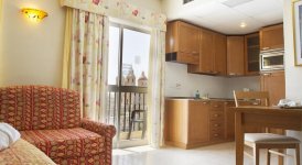 The Pergola hotel rooms and suites are spacious and furnished to a very high standard. All have a terrace or balcony overlooking one of the pools, and are equipped with private bathroom, hair dryer, air conditioning, Satellite TV, direct dial telephone, room safe. Amenities shared by self catering and hotel guests include a 24 hour reception service, lifts to all floors, under ground parking area, Launderette, lounge bar, pool bar and snack bar, pizzeria, mini leisure centre with use of free gym, indoor heated pool, two outdoor swimming pools and childrens pool. Please note that there isa utility charge payable at this resort,( this covers daily maid service, towels changed daily)