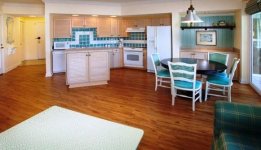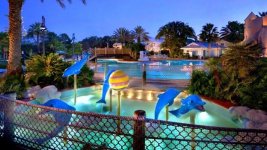In the very centre of the massive 45 squre mile Walt Disney World property, this superb resort has a regular free bus service to each of the 4 Disney Theme parks and to the 2 Disney Water Fun Parks. There is also a free waterbus to the Disney shopping village, several themed restaurants and Pleasure Island night time entertainment area. The studios feature two queen-size beds, table with two chairs, private balcony, microwave, refrigerator, coffeemaker and wet bar. The size of the studio's are approximately 376 sq ft. The one bedroom villas have a huge indoor living area with dining table and full American kitchen. Outdoors, there is a spacious private patio with table and chairs and water or golf course views. The bedroom has 2 Queen size double beds. The bathroom has a jacuzzi bath. There are 2 settee beds in the living area.