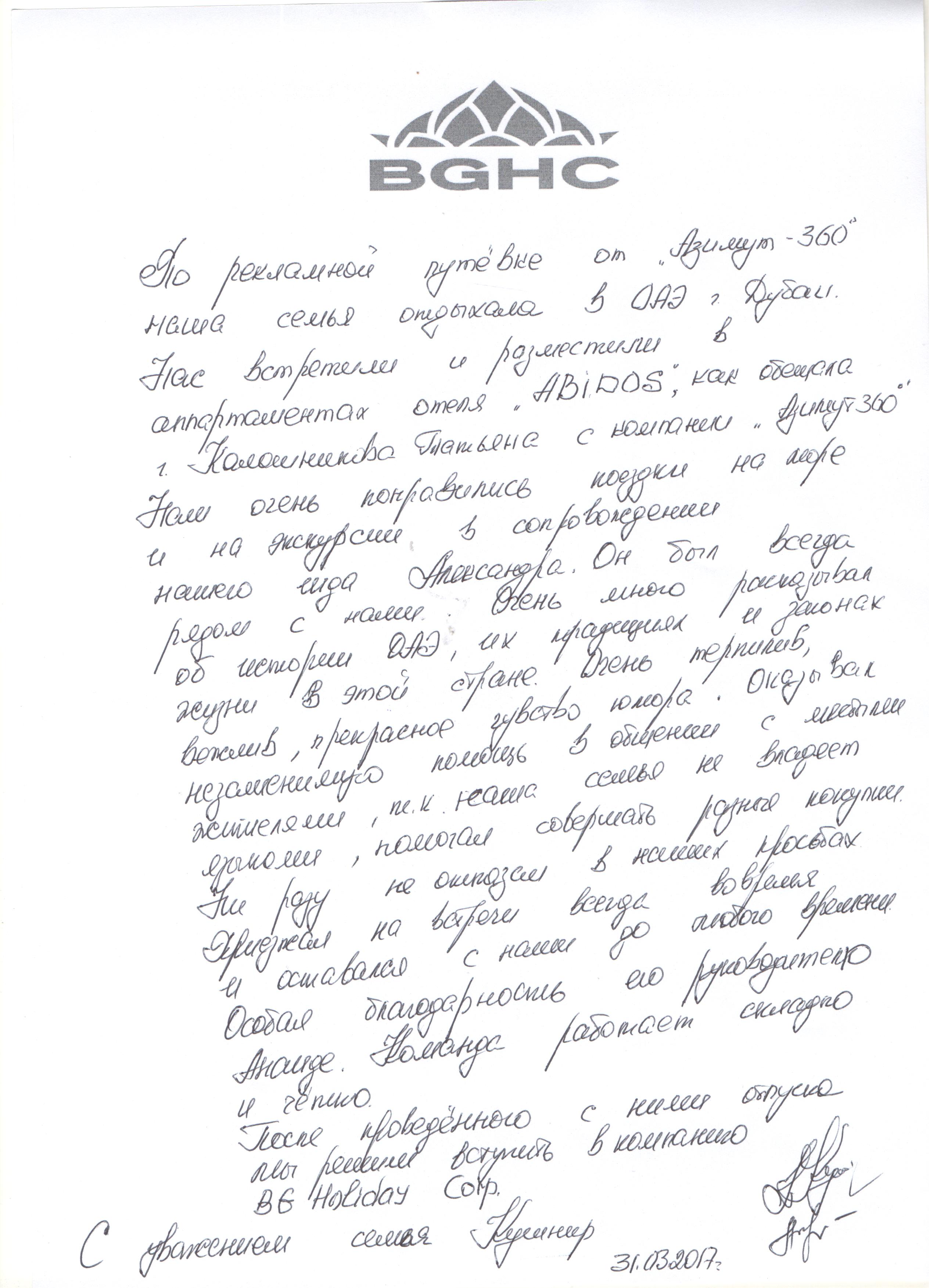 По рекламной путёвке наша семья отдыхала в ОАЭ, г. Дубай. Нас встретили и разместили в апартаментах отеля ABIDOS, как и обещала Калашникова Татьяна с компании "Азимут 360". Нам очень понравились поездки на море и на экскурсии в сопровождении нашего гида Александра. Он был всегда рядом с нами. Очень много рассказывал об истории ОАЭ, их традициях и законах жизни этой страны. Очень терпелив, вежлив и прекрасное чувство юмора. Оказывал незаменимую помощь в общении с местными жителями, так как наша семья не владеет языком, помогал совершать разные покупки. Ни разу не отказал в наших просьбах. Приезжал на встречи всегда вовремя и оставался с нами до любого времени. Особая благодарность его руководителю Анаиде. Команда работает складно и четко.