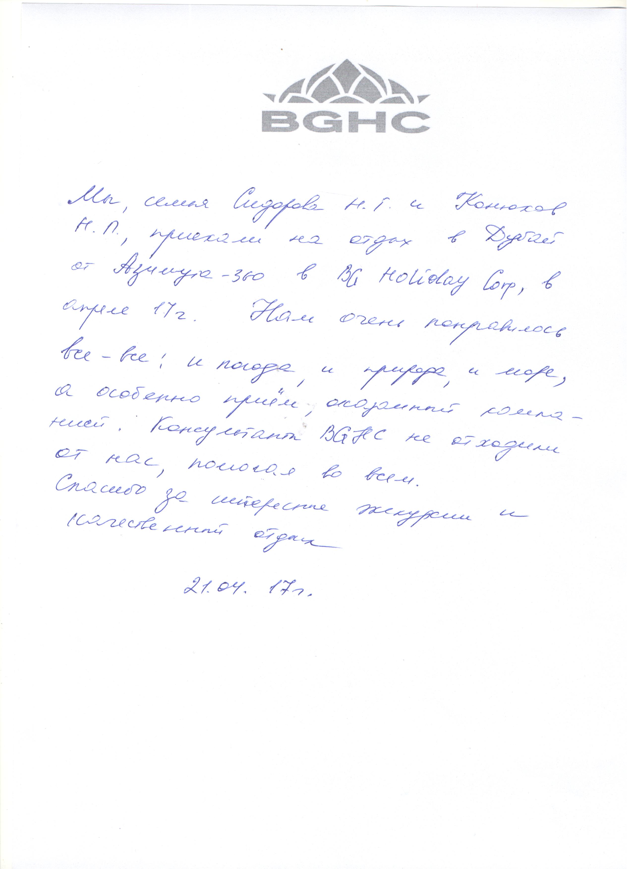 Мы, семья Сидорова Н.Г. и Конюхов Н.П., приехали на отдых в Дубай от Азимут 360 в BG Holiday Corp., в апреле 17г. Нам очень понравилось все-все: и погода, и природа, и море, а особенно прием оказанный компанией. Консультанты BGHC не отходили от нас, помогая во всем.